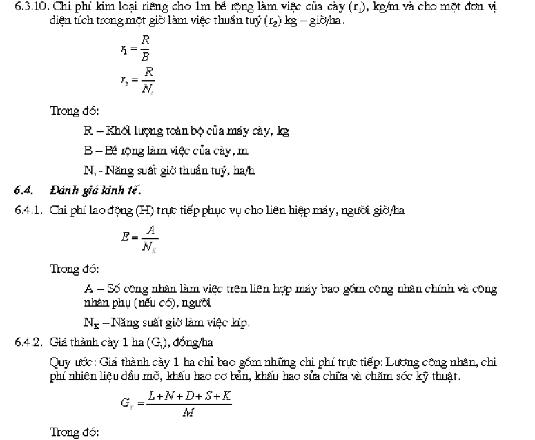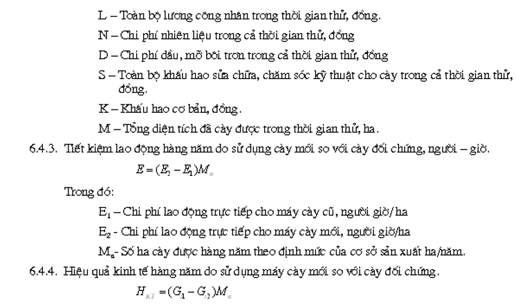 | Tổng diện tích đã cày được, ha Tổng chi phí lao động để cày được số diện tích trên, người/h Tổng chi phí trực tiếp, đồng - Toàn bộ lương công nhân trong thời gian thử, đồng - Chi phí nhiên liệu trong cả thời gian thử, đồng - Chi phí dầu mỡ bôi trơn trong cả thời gian thử, đồng - Toàn bộ chi phí cho sửa chữa, chăm sóc kỹ thuật…cho máy cày trong cả thời gian thử, đồng Khấu hao cơ bản, đồng Tiết kiệm lao động hàng năm do sử dụng cày mới, người, giờ Hiệu quả kinh tế hàng năm do sử dụng cày mới, đồng |