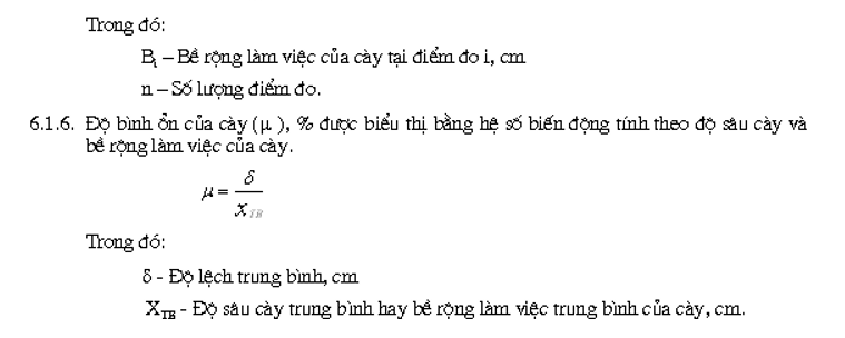 3.4.5. Khi thử với mục đích đánh giá đầy đủ khả năng làm việc của cày thì thử ở 3 số truyền làm việc chủ yếu của máy kéo ứng với hai độ sâu cày trong đó có một độ sâu theo yêu cầu của nông học và độ sâu cày thứ 2 tuỳ thuộc điều kiện cụ thể sẽ chênh lệch với độ sâu thứ nhất ± 4 cm.