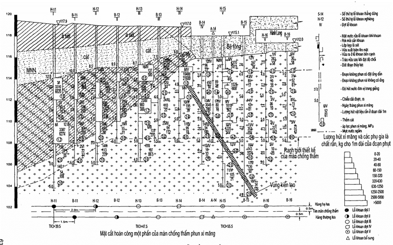 | Số thứ tự hố khoan kiểm tra | Số thứ tự đoạn phụt | Lượng mất nước đơn vị L/(min.m2) | Lượng phụt xi măng trên 1 m dài đoạn kg | Vận tốc lan truyền sóng đàn hồi sau khi phụt m/s |