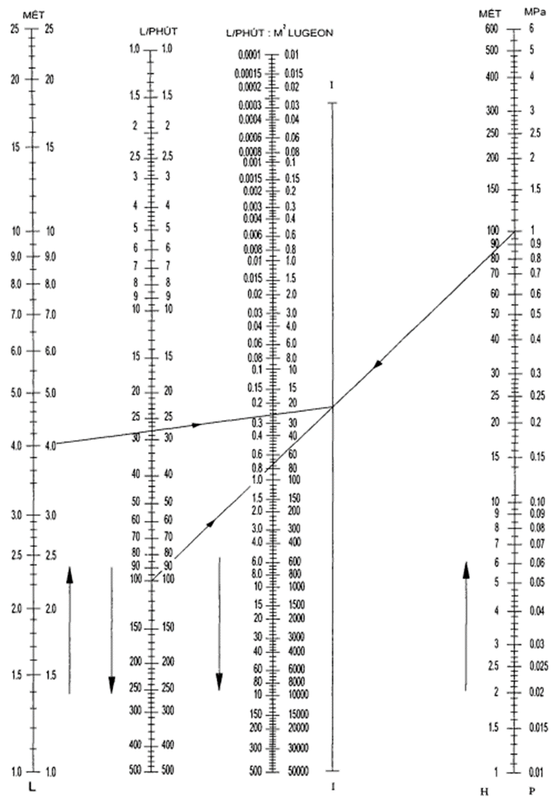 | Áp lực, MPa | Lượng mất nước đơn vị, L/ph.m.m | Áp lực, MPa | Lượng hút xi măng ở 1 m chiều dài đoạn, kg | ||