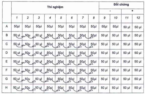 + Dùng pippette đơn kênh (6.3) hút 50 μl huyết thanh (B.3.4) cho vào giếng đầu tiên và pha loãng theo cơ số 2 bằng cách trộn đều rồi chuyển 50 μl sang giếng thứ 2, cứ như vậy đến giếng số 8 trộn đều rồi hút bỏ đi 50 μl;