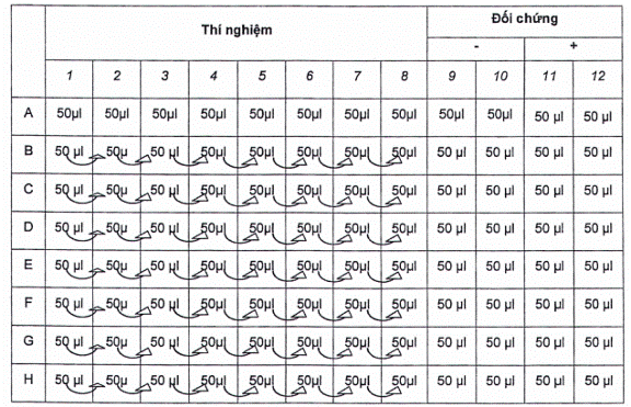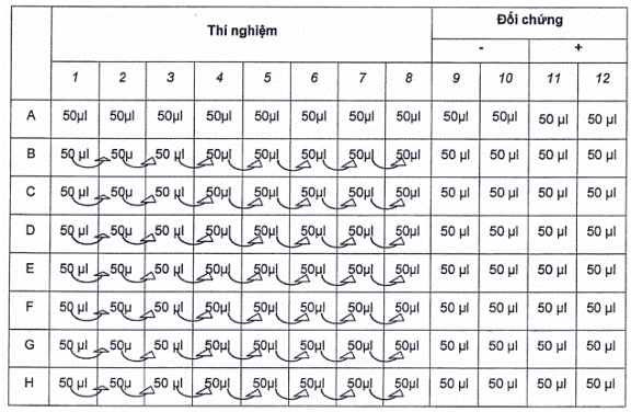+ Dùng pipette đa kênh (6.4) hút 50 μl huyết thanh (C.1.4) cho vào giếng đầu tiên và pha loãng theo cơ số 2 bằng cách trộn đều rồi chuyển 50 μl sang giếng thứ 2, cứ như vậy đến giếng số 8 trộn đều rồi hút bỏ đi 50 μl;