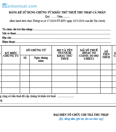 Bảng kê sử dụng chứng từ khấu trừ thuế TNCN - Biểu mẫu đính kèm Thông tư số 37/2010/TT-BTC
