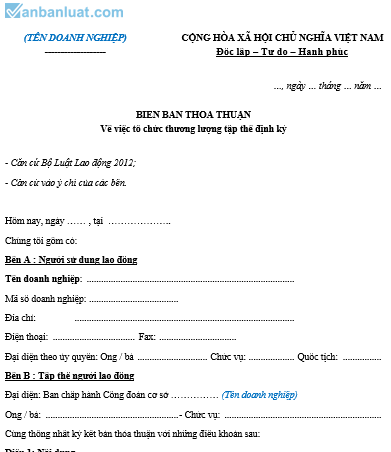 Cuộc họp thương lượng tập thể giữa Người sử dụng lao động và tập thể người lao động của …………… (Tên doanh nghiệp) sẽ tổ chức định kỳ mỗi năm ........................................................ /lần vào ngày .... (thời gian cụ thể)
