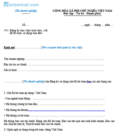 Số: … V/v: Đăng ký thực hiện hình thức, chế độ kế toán, sử dụng hóa đơn | …, ngày … tháng … năm … |