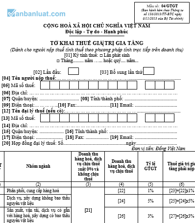 Tờ khai thuế giá trị gia tăng - Mẫu số: 04/GTGT (Ban hành kèm theo Thông tư số 156/2013/TT-BTC ngày 6/11/2013 của Bộ Tài chính)