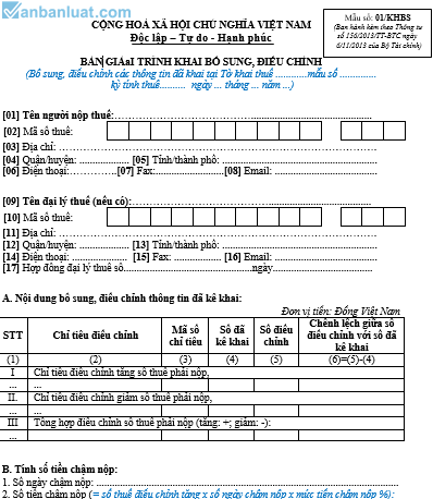 Bản giải trình khai bổ sung hồ sơ khai thuế - Mẫu số: 01/KHBS (Ban hành kèm theo Thông tư số 156/2013/TT-BTC ngày 6/11/2013 của Bộ Tài chính)