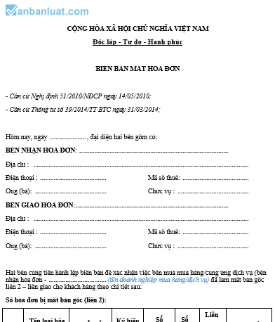 BIÊN BẢN MẤT HOÁ ĐƠN