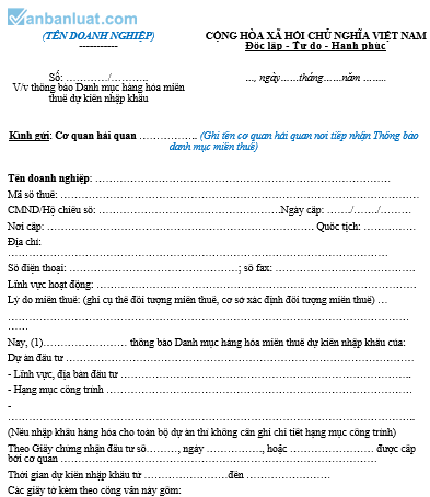 Nay, (1)…………………… thông báo Danh mục hàng hóa miễn thuế dự kiến nhập khẩu của: