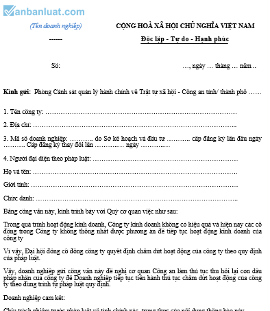 (Tên doanh nghiệp) ---------------------- Số: | CỘNG HOÀ XÃ HỘI CHỦ NGHĨA VIỆT NAM Độc lập - Tự do - Hạnh phúc ... , ngày ... tháng ... năm ... |