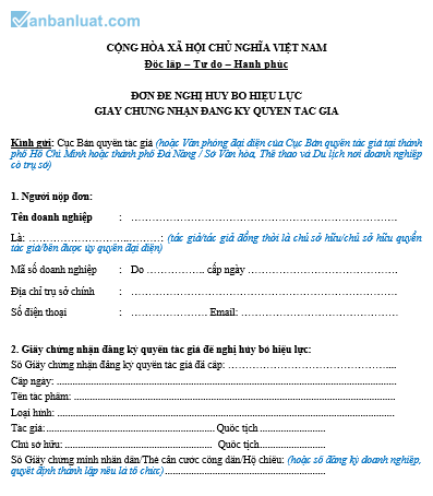Đơn đề nghị hủy bỏ hiệu lực giấy chứng nhận đăng ký quyền tác giả trong công ty hợp danh