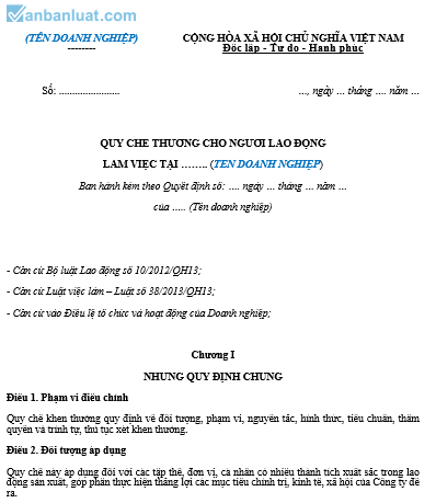 QUY CHẾ THƯỞNG CHO NGƯỜI LAO ĐỘNG