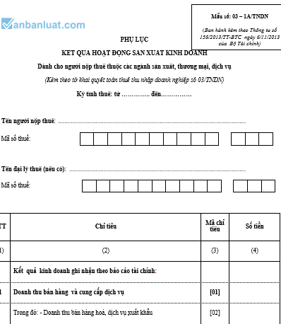 Phụ lục kết quả hoạt động sản xuất kinh doanh - Dành cho người nộp thuế thuộc các ngành sản xuất, thương mại, dịch vụ (Ban hành kèm theo Thông tư số 156/2013/TT-BTC ngày 6/11/2013 của Bộ Tài chính)