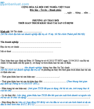 - Thời gian khấu hao tài sản dự kiến thay đổi: …………………………… (Theo khung thời gian quy định tại Thông tư số 45/2013/TT-BTC);