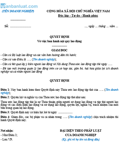 Điều 1: Nay ban hành kèm theo Quyết định này Thỏa ước lao động tập thể của ….. (Tên doanh nghiệp);