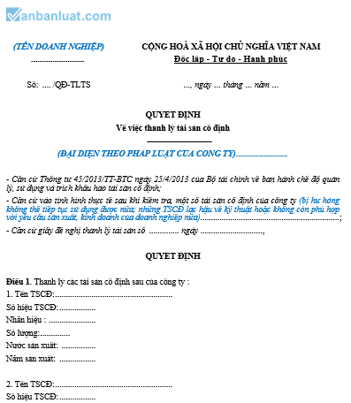 (TÊN DOANH NGHIỆP)......................... Số: ..... /QĐ-TLTS | CỘNG HOÀ XÃ HỘI CHỦ NGHĨA VIỆT NAM Độc lập - Tự do - Hạnh phúc …, ngày … tháng … năm … |