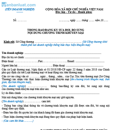 (Tên doanh nghiệp) …………………  thông báo/đăng ký sửa đổi, bổ sung nội dung của chương trình khuyến mại trên như sau:
