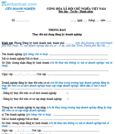 Doanh nghiệp đăng ký thay đổi nội dung đăng ký doanh nghiệp như sau: