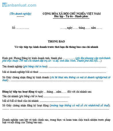 Về việc tiếp tục kinh doanh trước thời hạn đã thông báo của chi nhánh