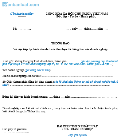 Trường hợp doanh nghiệp tiếp tục kinh doanh trước thời hạn đã thông báo, doanh nghiệp gửi thông báo đến Phòng Đăng ký kinh doanh nơi doanh nghiệp đã đăng ký chậm nhất 15 ngày trước khi tiếp tục kinh doanh trước thời hạn đã thông báo.