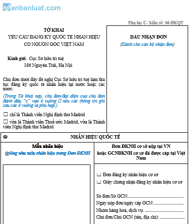 Tờ khai yêu cầu đăng ký quốc tế nhãn hiệu có nguồn gốc Việt Nam (mẫu 06-ĐKQT quy định tại Phụ lục C ban hành kèm theo Thông tư 16/2016/TT-BKHCN)