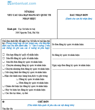 TỜ KHAI YÊU CẦU GIA HẠN ĐĂNG KÝ QUỐC TẾ NHÃN HIỆU