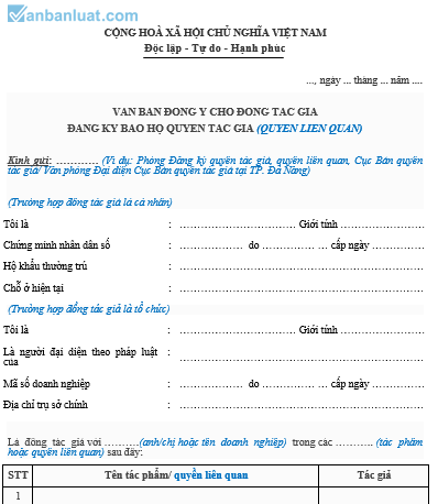 Tôi hoàn toàn đồng ý cho …………. (anh/chị hoặc tên doanh nghiệp) được đăng ký bảo hộ các ……………(tác phẩm / quyền liên quan) nói trên.