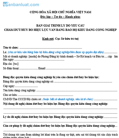 Lý do đề nghị chấm dứt/hủy bỏ hiệu lực Bằng độc quyền kiểu dáng công nghiệp:..................