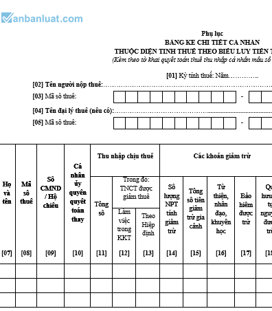 Bảng kê thông tin cá nhân thuộc diện tính thuế theo biểu lũy tiến từng phần