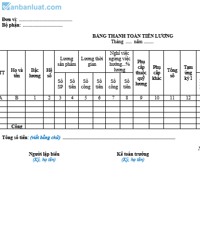 BẢNG THANH TOÁN TIỀN LƯƠNG