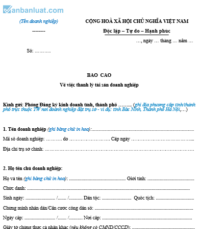 3. Thanh lý các tài sản của doanh nghiệp (Ghi rõ việc thanh lý tài sản, phân chia tiền mặt của doanh nghiệp và ngày hoàn thành)