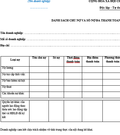 Loại nợ | Tên chủ nợ | Số nợ | Thời điểm thanh toán | Địa điểm thanh toán | Phương thức thanh toán | Ghi chú |