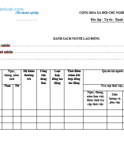 STT | Họ và tên | Ngày, tháng, năm sinh | Hộ khẩu thường trú | Công việc đang làm | Loại hợp đồng lao động | Thời điểm chấm dứt hợp đồng lao động | Quyền lợi người lao động | Ghi chú (các quyền lợi và nghĩa vụ khác trong HĐLĐ) (nếu có) | ||||