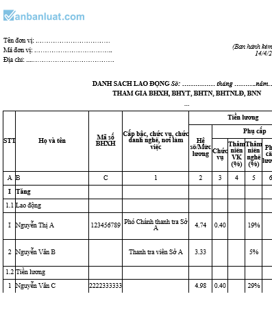 - Cột B: ghi rõ họ, tên của từng người lao động và ghi tương ứng vào từng mục tăng lao động, tăng tiền lương hoặc giảm lao động, giảm tiền lương.