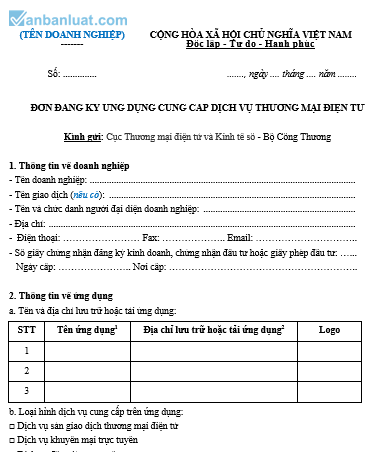 ĐƠN ĐĂNG KÝ ỨNG DỤNG CUNG CẤP DỊCH VỤ THƯƠNG MẠI ĐIỆN TỬ