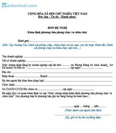 Đề nghị Quý cơ quan kiểm định và cấp “Giấy chứng nhận kiểm định phương tiện phòng cháy và chữa cháy” cho phương tiện/lô phương tiện ghi tại bảng thống kê kèm theo./.