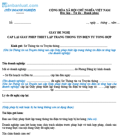 (Tên doanh nghiệp) .................................  đề nghị Sở Thông tin và Truyền thông ……………… (Ghi Sở Thông tin và Truyền nơi cấp Giấy phép thiết lập trang thông tin điện tử tổng hợp cho doanh nghiệp) cấp lại Giấy phép thiết lập trang thông tin điện tử tổng hợp số: ……,cấp ngày: ...................... tại