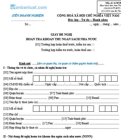 Giấy đề nghị hoàn trả khoản thu ngân sách nhà nước - Mẫu số: 01/ĐNHT (Ban hành kèm theo Thông tư số 156/2013/TT-BTC ngày 6/11/2013 của Bộ Tài chính)