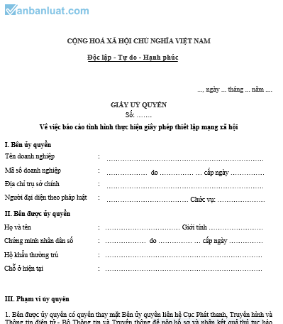 1. Bên được ủy quyền có quyền thay mặt Bên ủy quyền liên hệ Cục Phát thanh, Truyền hình và Thông tin điện tử để nộp hồ sơ và nhận kết quả thủ tục báo cáo tình hình thực hiện giấy phép mạng xã hội ……………………. (tên/tên miền của mạng xã hội) cho …………. (Tên doanh nghiệp);