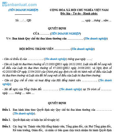 V/v: Ban hành Quy chế khen thưởng của …………….. (Tên doanh nghiệp)