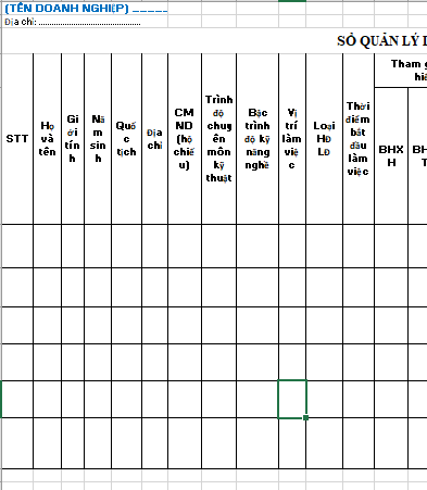 | STT | Họ và tên | Giới tính | Năm sinh | Quốc tịch | Địa chỉ | CMND (hộ chiếu) | Trình độ chuyên môn kỹ thuật | Bậc trình độ kỹ năng nghề | Vị trí làm việc | Loại HĐ LĐ | Thời điểm bắt đầu làm việc | Tham gia bảo hiểm | Tiền lương cơ bản | Nâng bậc, nâng lương | Số ngày nghỉ trong năm, lý do | Số giờ làm thêm | Hưởng chế độ BHXH, BHYT, BHTN | Học nghề, đào tạo, bồi dưỡng, nâng cao trình độ kỹ năng nghề | Kỷ luật lao động, trách nhiệm vật chất | Tai nạn lao động, bệnh nghề nghiệp | Thời điểm chấm dứt HĐLĐ và lý do |