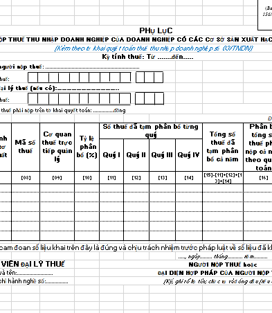 Phụ lục thuế thu nhập doanh nghiệp của doanh nghiệp có các CSSX hạch toán phụ thuộc