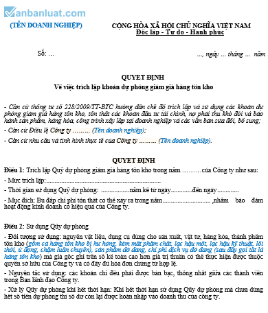 Điều 1: Trích lập Quỹ dự phòng giảm giá hàng tồn kho trong năm ........ của Công ty như sau: