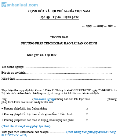 Nay, …………………… (Tên doanh nghiệp) thông báo đến Chi Cục thuế ...................... phương pháp trích khấu hao tài sản cố định như sau: