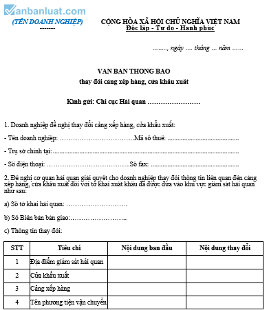 1. Doanh nghiệp đề nghị thay đổi cảng xếp hàng, cửa khẩu xuất:
