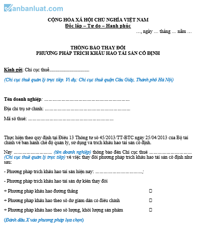 Nay ……………………… (tên doanh nghiệp) thông báo đến Chi cục thuế ………………………… (Chi cục thuế quản lý trực tiếp) về việc thay đổi phương pháp trích khấu hao tài sản cố định như sau: