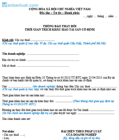 Nay ……………………… (tên doanh nghiệp) thông báo đến Chi cục thuế ………………………… (Chi cục thuế quản lý trực tiếp) về việc thay đổi thời gian trích khấu hao tài sản cố định như sau: