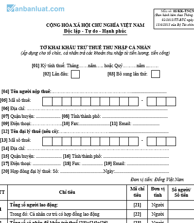 Tờ khai khấu trừ thuế thu nhập cá nhân - Mẫu số: 05/KK-TNCN (Ban hành kèm theo Thông tư số 92/2015/TT-BTC ngày 15/6/2015 của Bộ Tài chính)