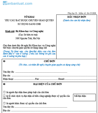 TỜ KHAIYÊU CẦU BẮT BUỘC CHUYỂN GIAO QUYỀN SỬ DỤNG SÁNG CHẾKính gửi: Bộ Khoa học và Công nghệ (Cục Sở hữu trí tuệ) 386 Nguyễn Trãi, Hà Nội Chủ đơn dưới đây đề nghị Bộ Khoa học và Công nghệ bắt buộc chuyển giao quyền sử dụng sáng chế (Trong Tờ khai này, chủ đơn/đại diện của chủ đơn đánh dấu"x" vào ô vuông nếu các thông tin ghi sau các ô vuông là phù hợp.) | DẤU NHẬN ĐƠN(Dành cho cán bộ nhận đơn) | ||