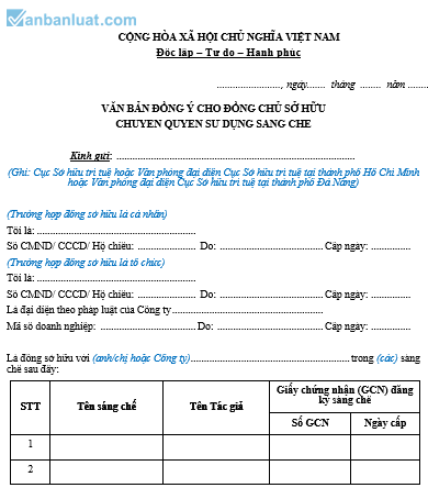 Văn bản đồng ý cho đồng sở hữu chuyển quyền sử dụng sáng chế trong công ty TNHH hai thành viên trở lên